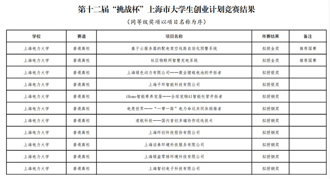 本次大赛分校级初赛、市级复赛和决赛三个阶段,经遴选推荐、专家评审,我校4个项目和上海其余高校200个项目入围市级决赛,共同角逐金奖、银奖及铜奖。其中,我校电气工程学院周勇良同学负责、刘建锋老师指导的《基于云服务器的配电架空线路自动化预警系统》和计算机科学与技术学院靳文星同学负责、成贵学、奉起超老师指导的《社区物联网智慧充电系统》2项作品勇夺大赛金奖;环境与化学工程学院顾榕同学负责、闵宇霖老师指导的《上海绿色动力有限公司--商业锂硫电池的开拓者》和自动化工程学院王丹豪同学负责、彭道刚老师指导的《上海千环智能科技有限公司》2项作品摘得大赛银奖。另外,电子与信息工程学院、国际交流学院、环境与化学工程学院、能源与机械工程学院、自动化工程学院的《iHome智能寄养宠屋—全球宠物AI智能托管开拓者》、《电亮世界——“一带一路”电力命运共同体助推者》、《凌航科技—国内首创多端协作巡线技术》、《上海环创科技股份有限公司》、《上海洁泰环境科技服务有限公司》、《上海绿益零排环境科技有限公司》及《上海智创电子科技有限公司》7项作品荣获大赛铜奖。