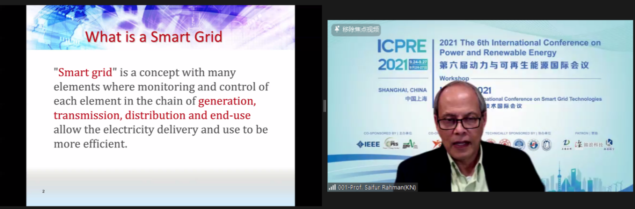 IEEE Life Fellow、IEEE2021总主席候选人、美国弗吉尼亚理工大学Saifur Rahman教授就智能电网在促进可再生能源应用中的作用发表了主题演讲,还介绍了可再生能源的运行特点,以及智能电网的各个方面包括技术、标准和法规等。