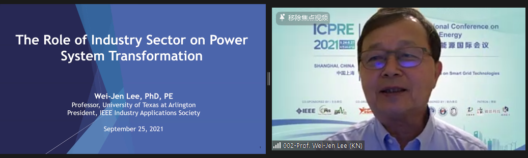 IEEE工业应用协会(IAS)主席、美国阿灵顿德克萨斯大学Wei-Jen Lee教授(IEEE Fellow)在大会报告中谈到工业部门在电力系统转型中的作用,并讨论了到 2050 年实现零碳排放目标所需的方法和增强的操作等。此次,两位教授因疫情原因未能赶赴现场,但仍然通过线上的方式与现场的观众进行了积极的交流互动。