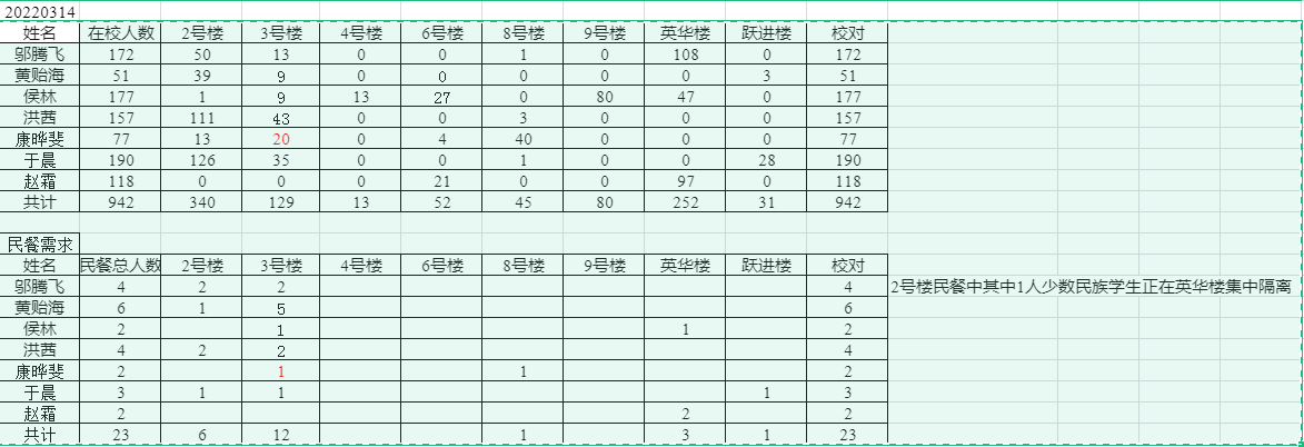 于晨老师,虽然家中小区封闭,但他却依然坚持工作,对于每一数据始终要求准确无误,开学至今二十多天我们已经经历7次的核酸检测,在沪学生、在沪不在校、未采样检测、采样检测结果未出、采样结果已出、集中隔离、外地学生这些数据需要于晨老师每日统计更新,辛苦不言而喻。