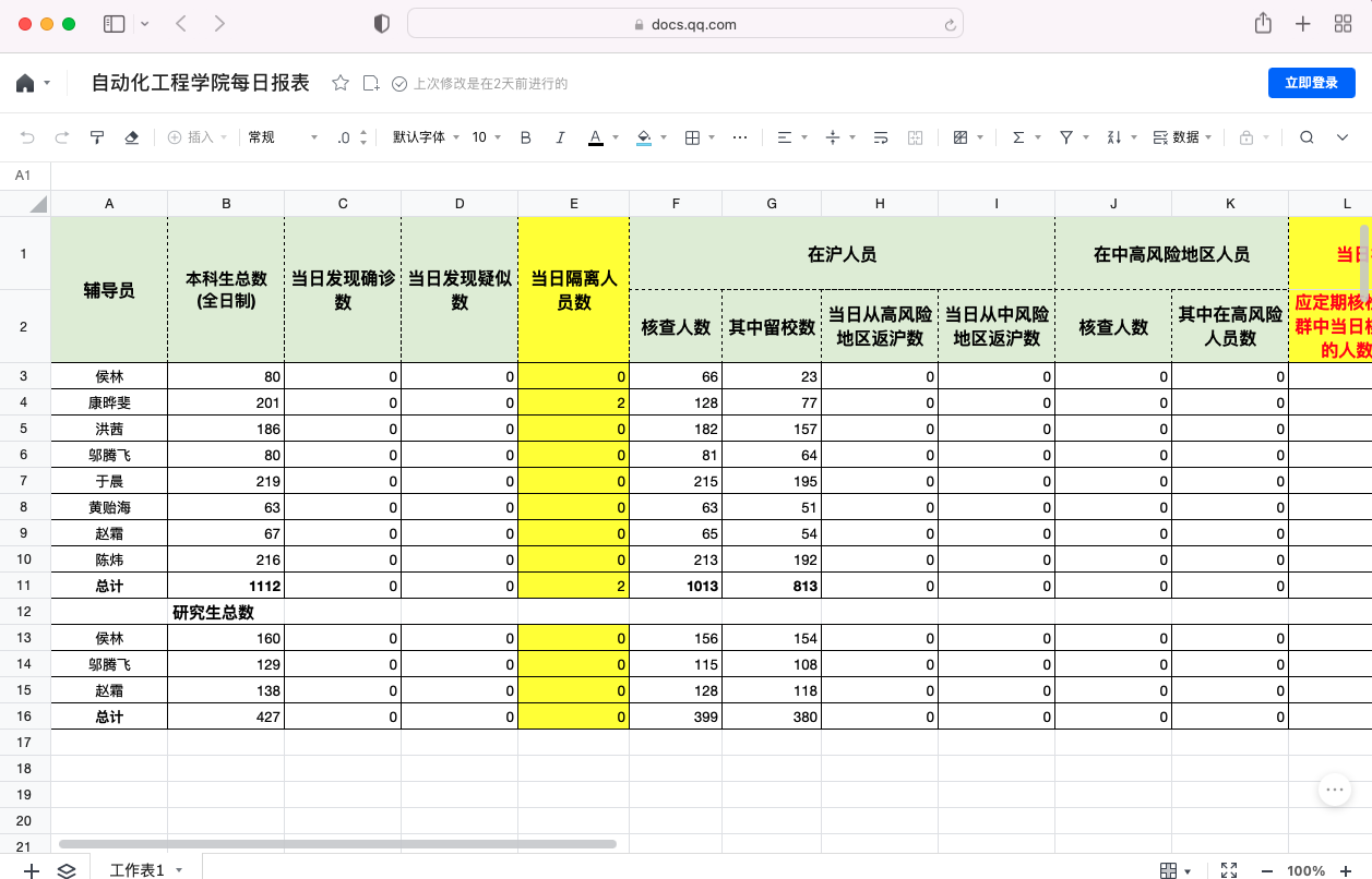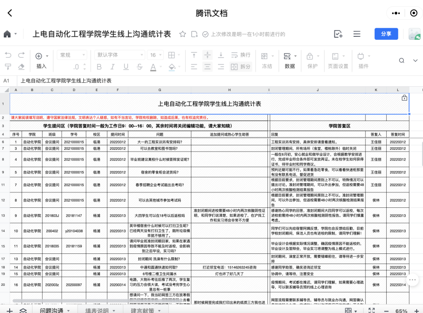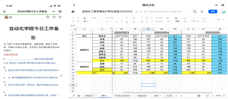 当上海疫情防控工作紧张开展的同时,作为人群密集高校群体,自动化学子在校园内生活似乎与往常一样,学习、娱乐都在按部就班的进行。这背后是学院大量学生数据的高度精确化结果,一千多人的上万条信息,在日出日落间不断流动变化。信息统计的工作要是以前需要耗费学工队伍大量的时间精力去核查排摸,现在,在学院党委副书记王佳丽的带领下,学院10名专兼职辅导员充分发扬党员与时俱进的优良传统,积极主动学习利用在线表格和文档处理数据,分区分类分人,学院1413名在沪本研学生的行程、核酸采样等信息数据在一个共享表格中供辅导员老师核查更新,做到信息实时全覆盖。为自动化学子的日常管理工作提供了坚实有力保障,“心中有数,遇事不慌”。同时打造线上沟通交流平台,方便同学提问,并安辅导员线上值班实时解答。