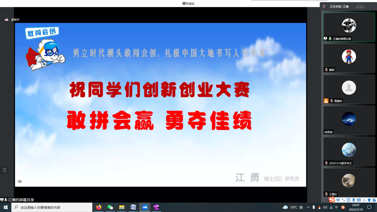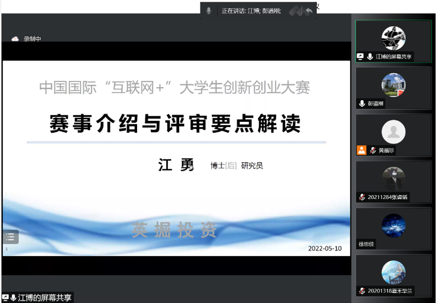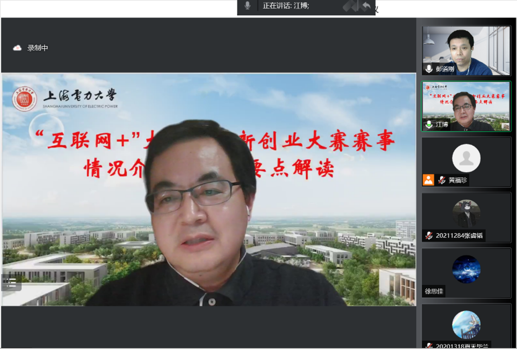 正值第八届中国国际“互联网+”大学生创新创业大赛如火如荼开展之际,为响应国家号召,全面深化高校创新创业教育改革、提升大学生创新创业能力、加快培养创新创业人才, 2022年05月10日晚,自动化工程学院邀请江勇博士(后)、研究员做了一场关于《“互联网+”大学生创新创业大赛赛事情况介绍与评审要点解读》的线上专题报告,报告由我院彭道刚院长主持,我校自动化、电气、计算机、电信、经管、数理、环化、工训中心等院部近450名师生聆听了本场报告。