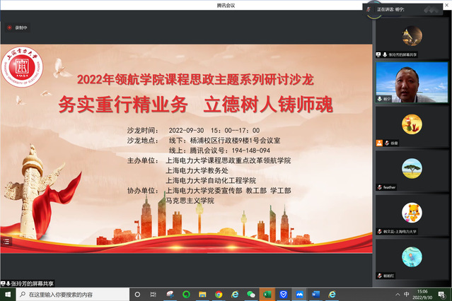 为弘扬高尚师德,践行师德规范,深入推进课程思政与师德师风建设的有机结合,9月30日,由计算机科学与技术学院与教务处、自动化工程学院联合主办,校党委宣传部、教工部、学工部与马克思主义学院协办的课程思政主题系列研讨沙龙(三)之“务实重行精业务 立德树人铸师魂”沙龙在杨浦校区行政楼9楼1号会议室以线上线下结合的形式召开。本次沙龙邀请到自动化工程学院杨平教授进行主题交流,研讨沙龙由教务处处长杨宁与计算机学院常务副院长张传林联合主持。全校相关职能部门与二级学院逾200名教师参加了此次研讨沙龙。