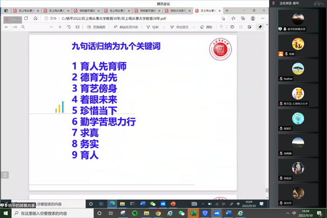 随后,杨平老师作主题报告,他回顾了从事大学教育38年的经历,分享了他提炼的关于大学教育的九点感悟。他谈到,当教师要育人先育师,教师要拥有科学家的素养、工程师的品性、教育家的精髓;德育为先,教师要引导学生以品德高尚、能力出众、乐于奉献为追求;育艺傍身,教师要重视教学规律,讲究育人方法、导好学习大戏。做学生要着眼未来,以未来发展为导向、增学问、长才干、开眼界;珍惜当下,珍惜学习资源、专心领悟教师教诲;勤学苦思力行,善于学习、用于实践、独立思考、凝练真知。办大学要求真、务实、育人,要实事求是,真学真问求真知;务实致用,精益求精敢创新;智慧育人,千锤百炼造英才。杨老师以上海电力大学发展过程中对学校做出杰出贡献的周国定老师的事迹、誉满电业的数字温度巡测仪、为高压直流输电而研制高参数可控硅及二十年磨一剑的《自动控制原理》教材等为例阐释了当教师、做学问及办大学的要点,为与会教师上了一堂精彩生动的课程思政示范课。