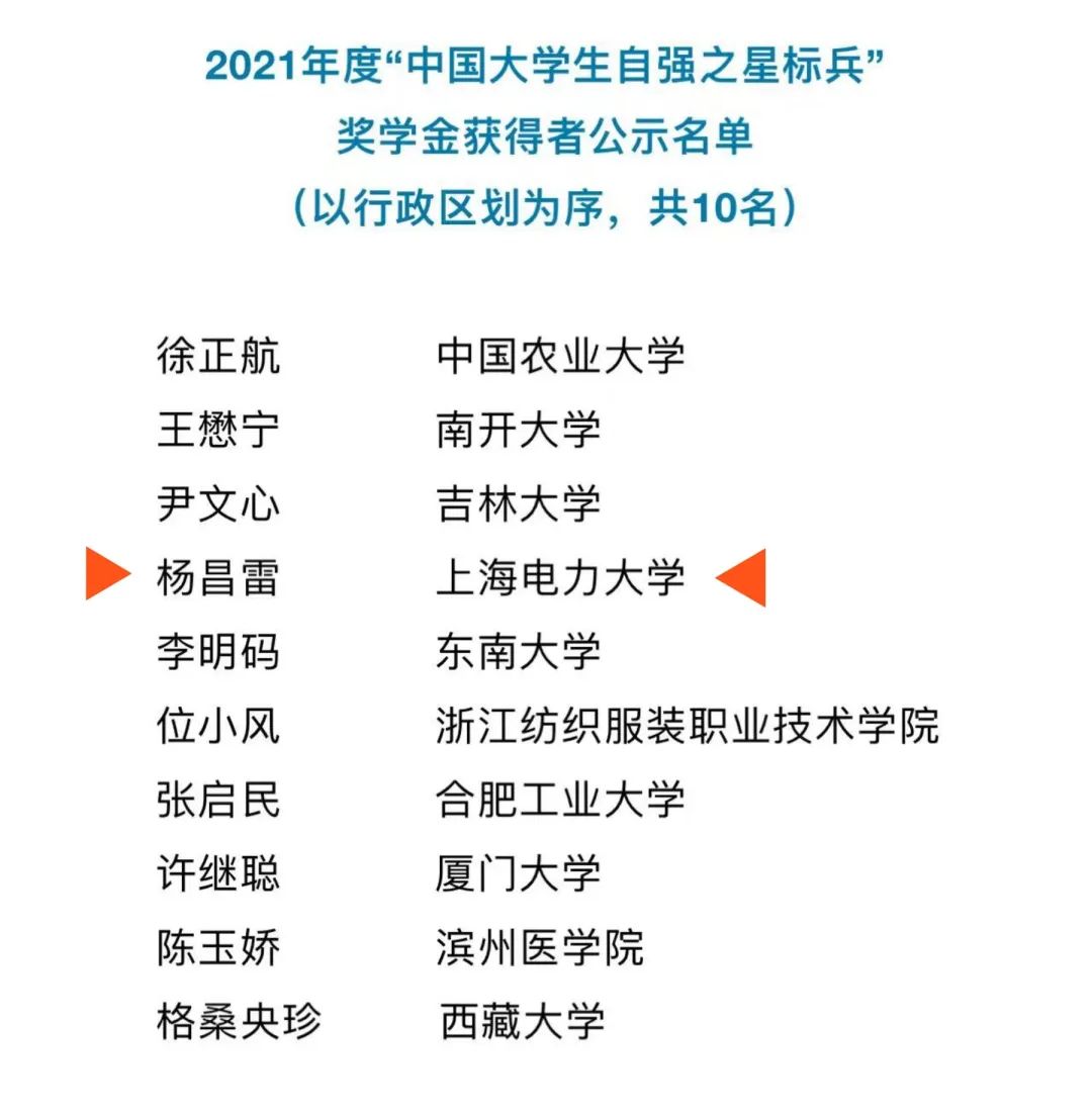 日前,由共青团中央、全国学联指导,中国青年报社、新东方教育科技集团、中国青年创业就业基金会联合开展的2021年度“中国大学生自强之星”奖学金评定结果在中华全国学联公众号上公布,经高校推荐、省级初评、全国评审等环节,最终确定“中国大学生自强之星标兵”奖学金获得者10名。其中,我校自动化工程学院自动化专业的杨昌雷同学荣获2021年度“中国大学生自强之星标兵”奖学金,我校学子首次获得该项荣誉。