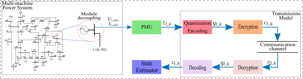 题为Secure particle filtering with Paillier encryption-decryption scheme: Application to multi-machine power grids的论文发表在IEEE Transactions on Smart Grid, 该期刊是智能电网领域的顶级期刊(SCI 1区Top, 2023年IF: 10.275)。(DOI:10.1109/TSG.2023.3271949)。文章指出,随着信息化及数字化技术的不断应用,传统电力系统也正转变成为一个庞大而复杂的信息物理融合系统。然而,这些新兴技术的引入不可避免的使电力系统信息流面临被窃听的风险,同时也可能使得整个电力系统暴露于网络安全威胁之中。因此,为了有效保护数据隐私并提高状态估计的安全性,本文基于Paillier加密-解密机制为同步发电机设计了安全状态估计算法。具体围绕以下3点:一是量测数据在通过通信网络传输之前被映射到了密文空间以保障其的隐私性及安全性;二是基于粒子滤波算法解决了同步发电机的强非线性及可能存在的非高斯噪声给状态估计的准确性所带来的影响;三是改进了粒子滤波算法的似然函数设计方法,使得其能够应对Paillier加密-解密机制引入后对量测数据分布的改变。