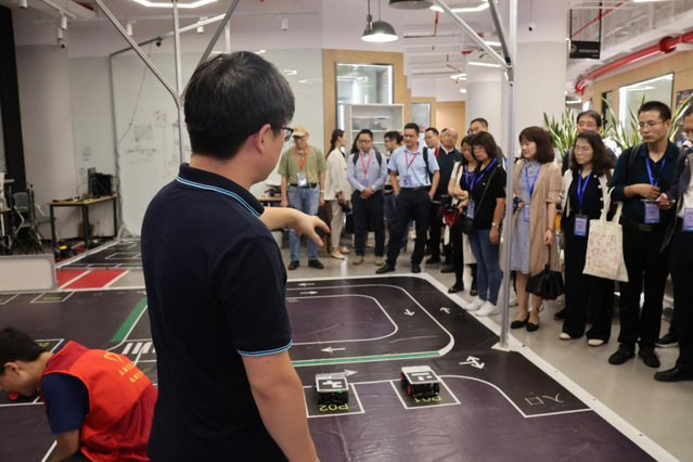 最后,与会代表共同参观了交大自动化系教学实验室以及交大E谷(教学发展与学生创新中心)。实验室的老师与与会代表深入交流,分享了实验室最新的教研、教仪、科创及科研成果,回答了与会代表的提问,并探讨了未来的合作机会。