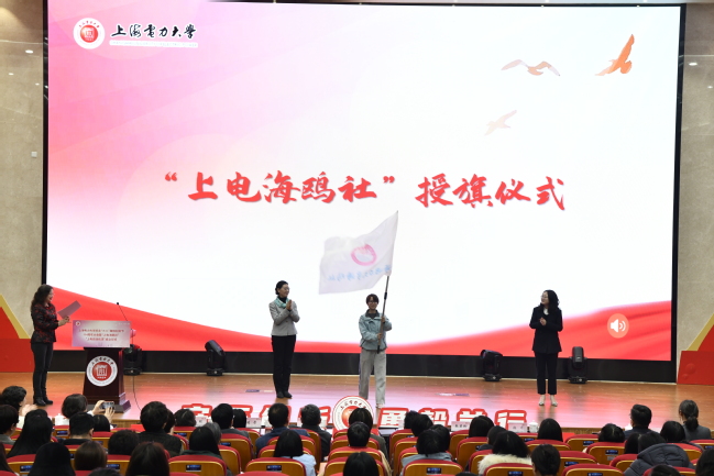 在“上电海鸥社”成立仪式上,通过三位女学生的自述表演传递出创社初衷——全面赋能女大学生成长。社团旗帜在上海市妇女联合会副主席张庆玲、海鸥社团委指导老师陈铭洲、海鸥社社长陈曦手中传递,飘扬的旗帜挥舞在会场。