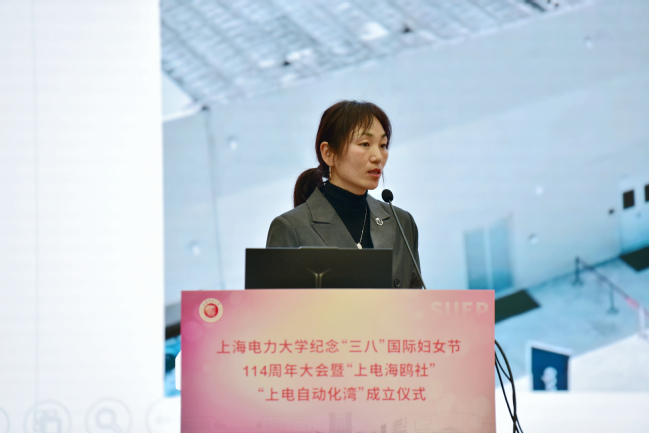 随后,上海市妇女联合会副主席张庆玲发表了讲话。她对“上电湾”成立以来进行的一系列有益探索表示了肯定,对全市第一家面向“海鸥计划”的大学生社团——“上电海鸥社”、第一个由二级学院建立的海鸥湾子湾“上电自动化湾”的挂牌成立表示祝贺,并对社团提出了三点建议与大家共勉:一是坚定理想信念,带领广大师生听党话、跟党走;二是积极担当作为,激发广大女性师生投身高质量发展的主动性;三是注重对大学生新型婚育文化的培养,为社会发展筑牢家庭基石。最后她寄语上海电力大学的女性师生:继续以“痛点”为“出发点”,坚持问题导向谋划工作;继续以“重点”为“着力点”,坚持围绕中心推进工作;继续以“亮点”为“增长点”,坚持与时俱进创新工作。