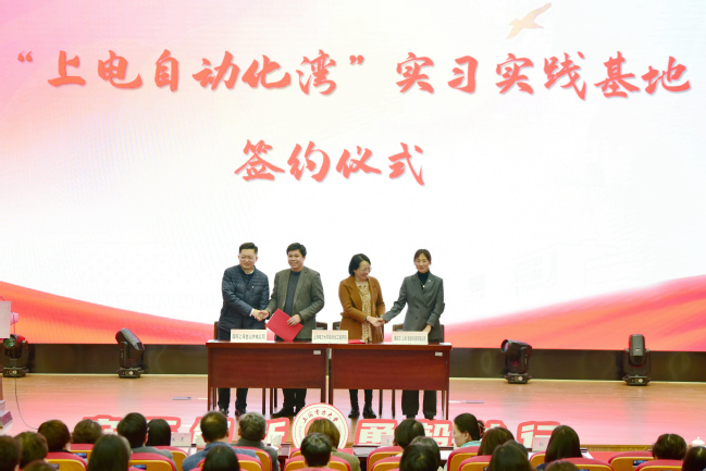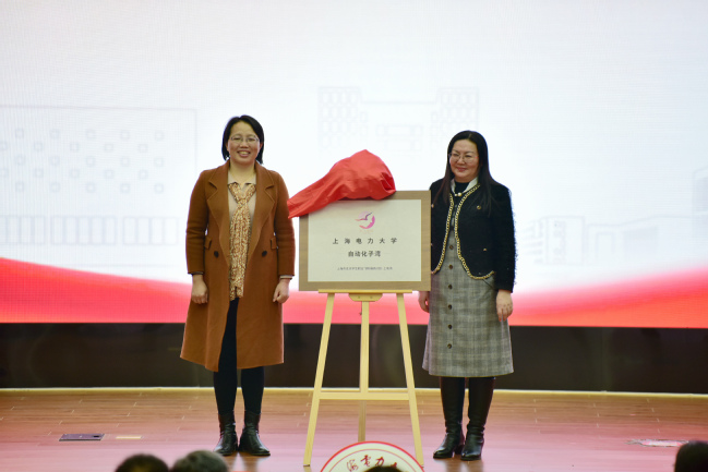 自动化工程学院党委书记刘莉对“上电湾”子湾“上电自动化湾”的建设背景及设想进行了详细的介绍。之后,上海市教育系统妇工委副主席张芳与刘莉共同为“上电自动化湾”揭牌。国网上海金山供电公司党委书记王俊、康码芯(上海)智能科技有限公司总经理郭会娟代表各自单位与自动化工程学院进行了“上电自动化湾”实习实践基地签约。