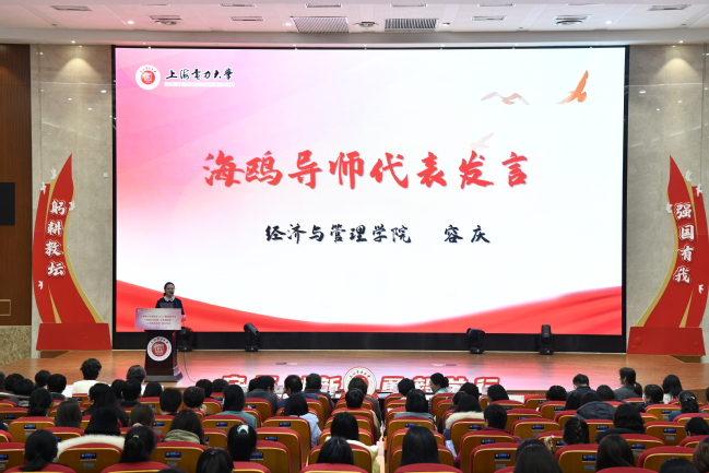 校总会计师张川,海鸥计划策划人、上海市女企业家协会副会长蔡婷共同为新一届“1+X人生导航”导师暨海鸥导师颁发聘书后,经济与管理学院容庆老师作为海鸥导师代表发言,分享了在促进女大学生学业、科研、职场的成长成才的过程中的实践和探索。
