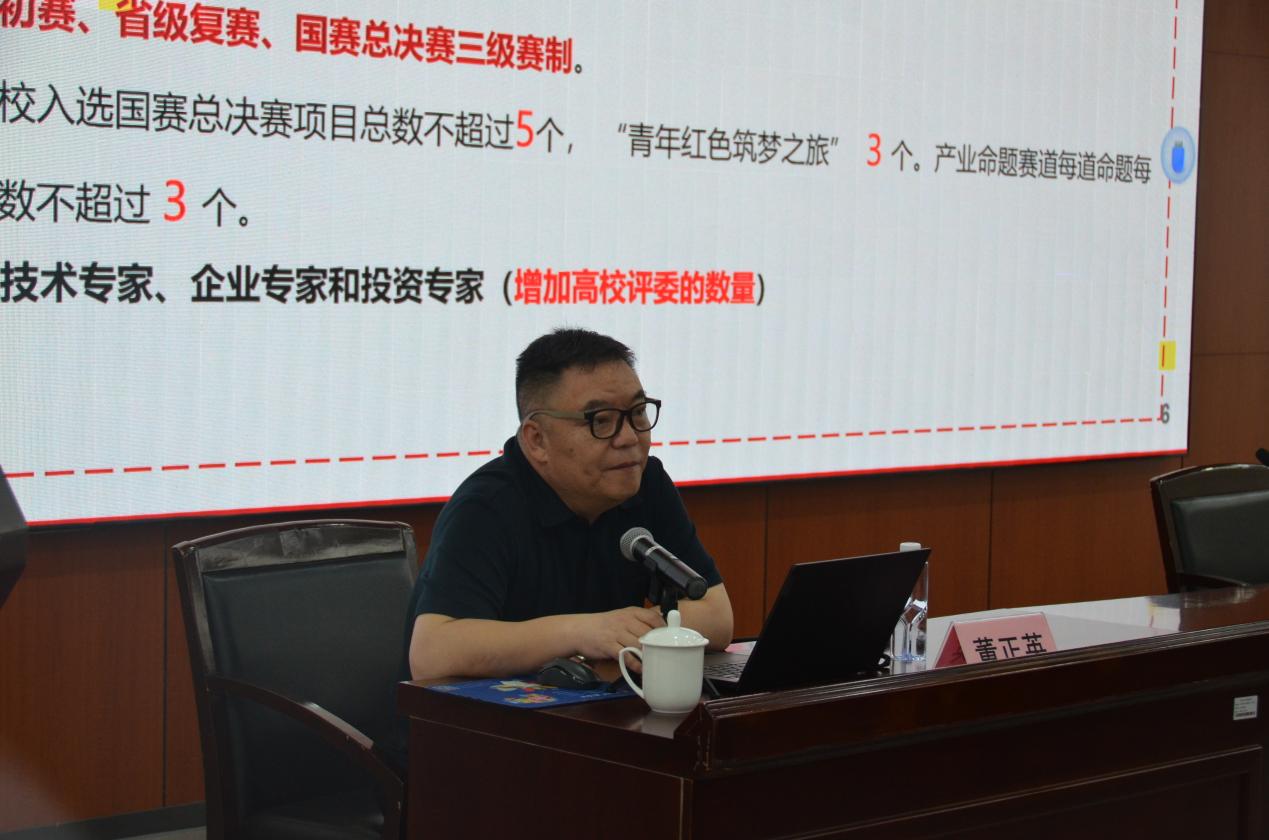 杨宁致欢迎词,他强调了中国国际大学生创新大赛是贯彻落实党的二十大精神,深入贯彻落实习近平总书记关于教育的重要论述和给“青年红色筑梦之旅”大学生重要回信精神的重要比赛,通过比赛的组织和参与,实现以赛促教、以赛促学、以赛促创,切实提高学生的创新精神、创新意识和创新能力,他鼓励我校师生以第十届大赛作为新的起点,指导老师要充分发挥专业优势,为创新大赛提供有力的指导和支持,参赛同学以“我敢闯、我会创”的青春魄力,展示非凡的思辨能力和创新能力。