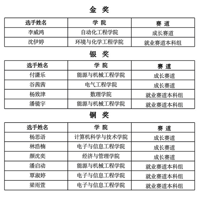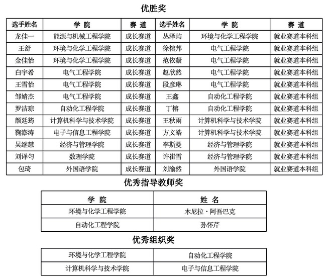最终,自动化工程学院李威鸿获得成长赛道金奖、环境与化学工程学院沈伊婷获得就业赛道本科组金奖;两位金奖选手的指导教师孙怀芹、木尼拉·阿吾巴克获得优秀指导教师奖;环境与化学工程学院、自动化工程学院、计算机科学与技术学院、电子与信息工程学院获得优秀组织奖。